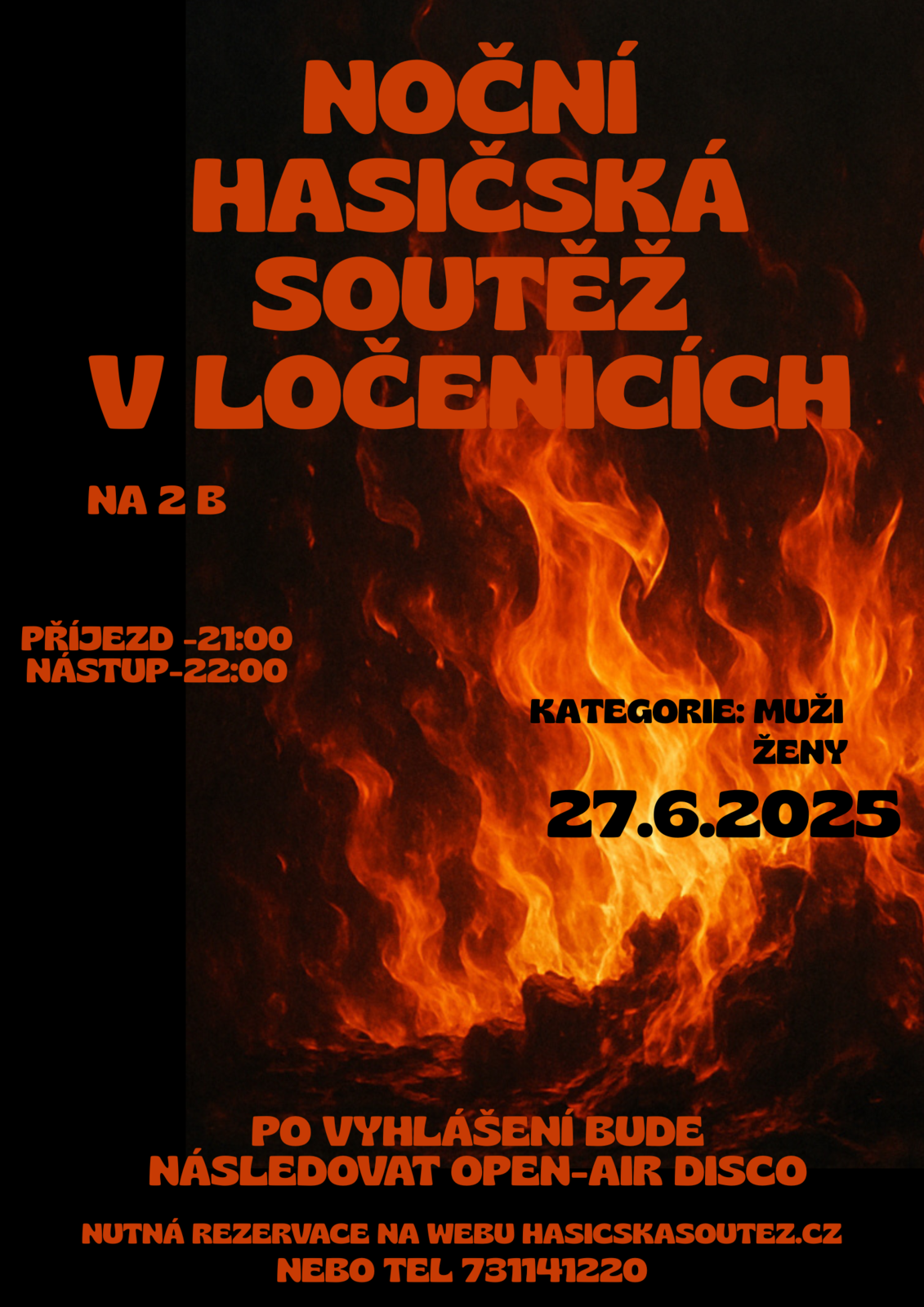 NOČNÍ HASIČSKÁ SOUTĚŽ Ločenice. Registrace:https://www.hasicskasoutez.cz/locenice-2025/rezervace/